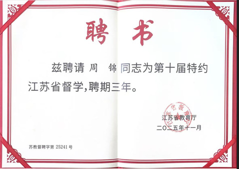 近日,江苏省教育厅公布第十届特约江苏省督学聘任名单,经民盟江苏省委推荐,民盟江苏省第六届青年工作委员会副主任、我校民盟委员会委员、雷丁学院院长周锦教授获聘。